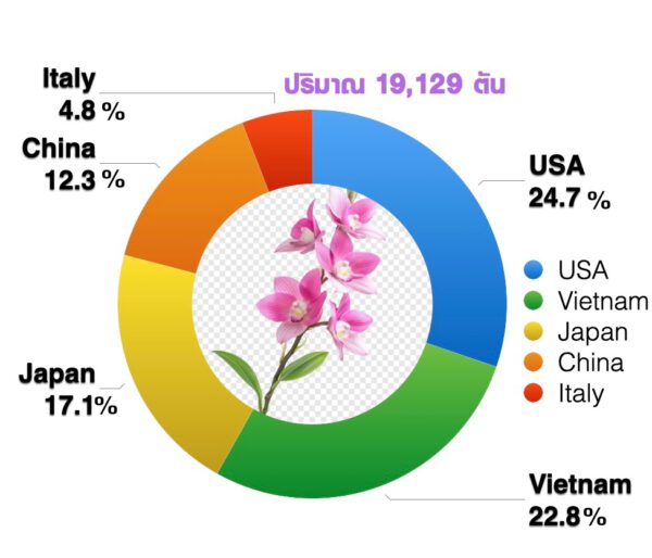 โดยกล้วยไม้ เป็นสินค้าไม้ตัดดอกที่ไทยส่งออกมากที่สุด ปริมาณ 19,129 ตัน มูลค่า 2,181 ล้านบาท